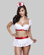 Zmysłowy kostium pielęgniarki Mariana to idealna propozycja na gorące roleplay i erotyczne przebieranki. Składa się z trzech elementów: krótkiego, marszczonego biustonosza wiązanego na plecach, otwartego figo-fartuszka z kokardkami i czerwonymi satynowymi wstążkami oraz ozdobnego czepka z czerwonym krzyżem na opasce. Każdy element wykonany został z lekkiego, białego materiału z dodatkiem elastycznego spandexu, który subtelnie dopasowuje się do ciała i podkreśla kobiece kształty. Uwagę przykuwa satynowy połysk wstążek i falbanki, które dodają kostiumowi figlarnego charakteru.