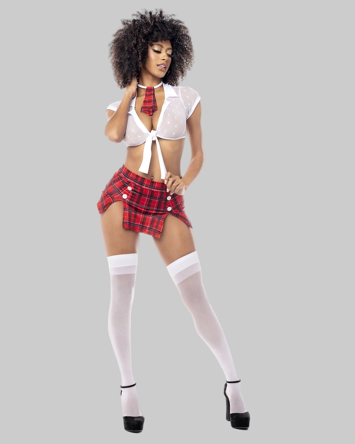 Wyzwól fantazję o niegrzecznej uczennicy w stroju Kimberly, który łączy prowokację z klasycznym motywem szkolnym. Ten trzyczęściowy komplet zawiera przezroczystą, krótką koszulę z wiązaniem pod biustem, ultrakrótką plisowaną spódniczkę w czerwono-czarną kratę z wysokimi rozcięciami oraz dopasowany czerwony krawat. Prześwitujący materiał i dopasowany fason podkreślają krągłości i dodają seksapilu, a całość tworzy pełen wdzięku i zabawy look - idealny na zmysłowe przebieranki.