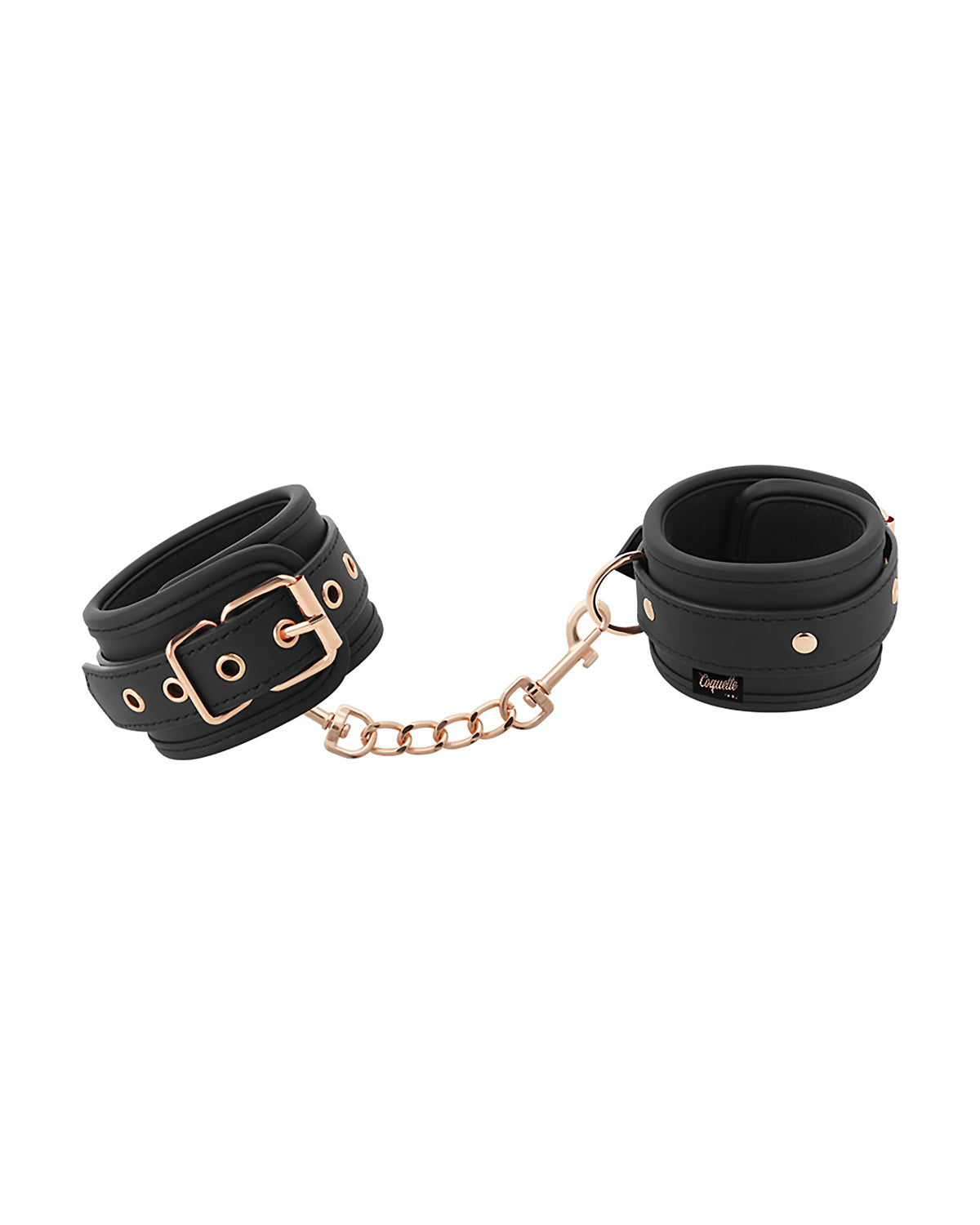 Kajdanki czarne, elementy metalowe w kolorze różowego złota.