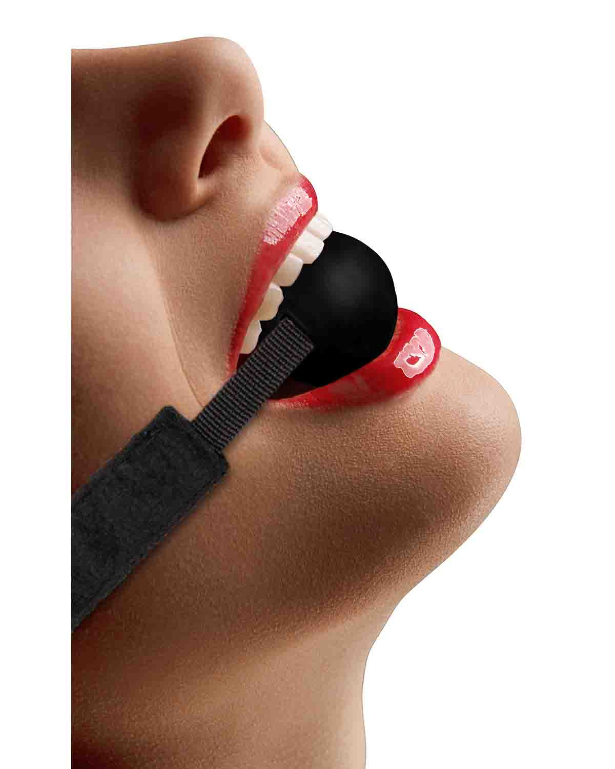 Klasyczny knebel z pełną kulką. Umieszczony na miękkim, pluszowym pasku. Nie wbija się w skórę i nie powoduje otarć.