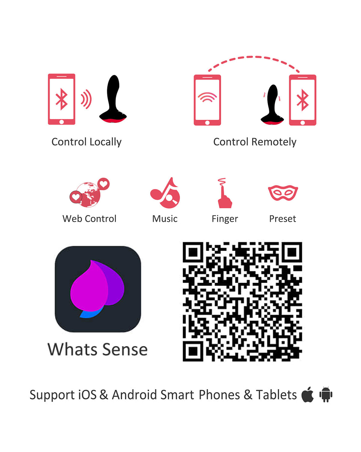 Aplikacja łączy się z urządzeniem przez Bluetooth lub Internet i steruje wibratorem dostarczając ekscytujących wibracji w różnych kombinacjach. Służy przy tym jako pilot zdalnego sterowania.
