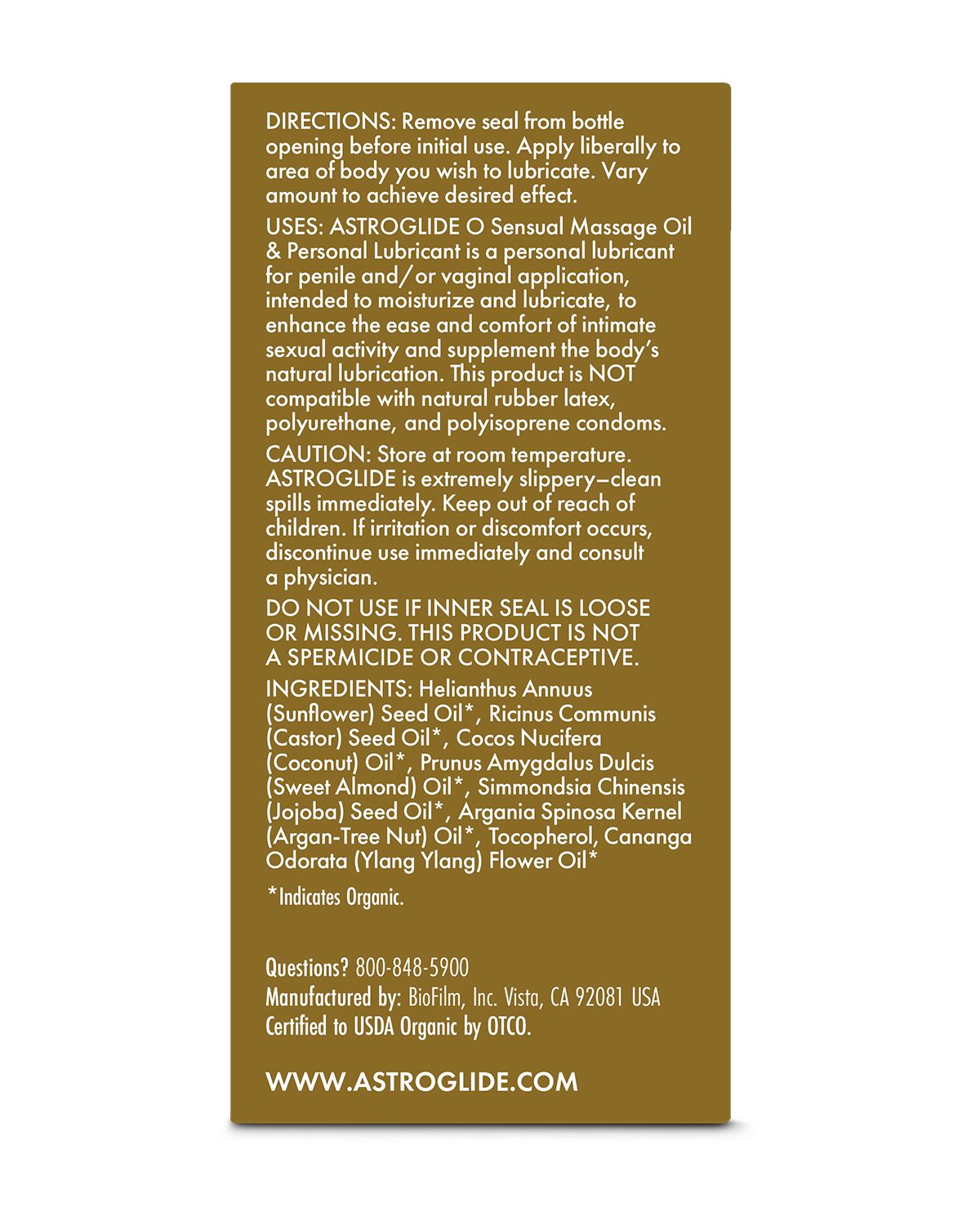 Cena jednostkowa / zaO Sensual Massage Oil and Lubricant marki Astroglide to luksusowy produkt, który łączy w sobie zaawansowaną formułę organicznych olejków roślinnych, stworzoną z myślą o zapewnieniu głębokiego nawilżenia i niezapomnianych wrażeń podczas masażu i intymnych chwil. Wyselekcjonowane składniki, takie jak olej kokosowy i olejek eteryczny z kwiatów Ylang Ylang, nie tylko odżywiają skórę, ale również pobudzają zmysły swoim zjawiskowym aromatem.