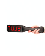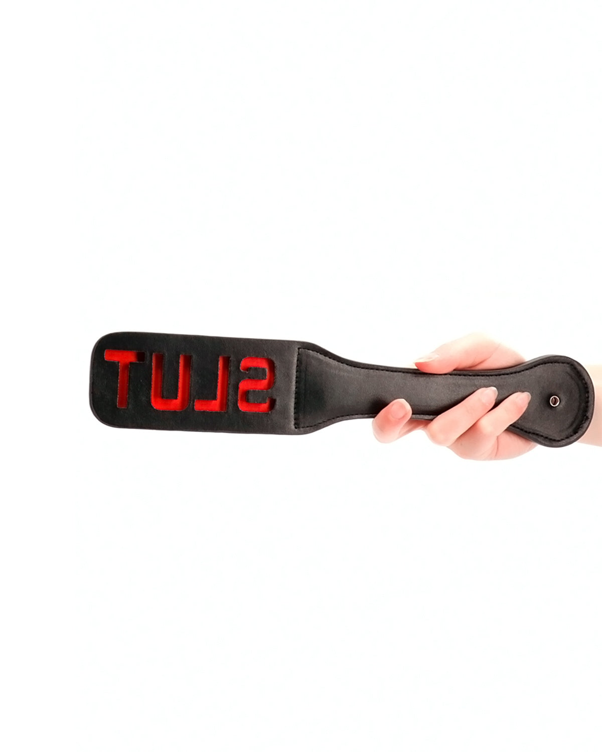 Cena jednostkowa / zaWyraź siebie w bezwstydny sposób - dosłownie. Packa z napisem SLUT to gadżet BDSM, który łączy moc klapsa z przekazem, jaki zostaje na skórze. Napis „SLUT” został wycięty odwrotnie, dzięki czemu może odcisnąć się na ciele uległej osoby po intensywnym uderzeniu. Czarno-czerwona stylistyka, trwałe szycie i elastyczna konstrukcja ze skóry syntetycznej (PU leather) czynią ją efektownym i funkcjonalnym dodatkiem do każdej sceny dominacji. Odpowiednia zarówno dla początkujących, jak i zaawansowanych miłośników BDSM.