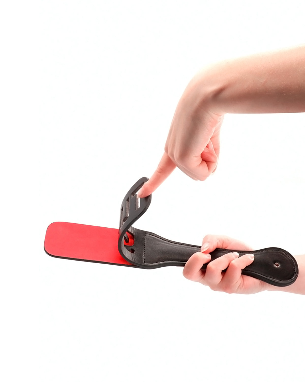 Wyraź siebie w bezwstydny sposób - dosłownie. Packa z napisem SLUT to gadżet BDSM, który łączy moc klapsa z przekazem, jaki zostaje na skórze. Napis „SLUT” został wycięty odwrotnie, dzięki czemu może odcisnąć się na ciele uległej osoby po intensywnym uderzeniu. Czarno-czerwona stylistyka, trwałe szycie i elastyczna konstrukcja ze skóry syntetycznej (PU leather) czynią ją efektownym i funkcjonalnym dodatkiem do każdej sceny dominacji. Odpowiednia zarówno dla początkujących, jak i zaawansowanych miłośników BDSM.