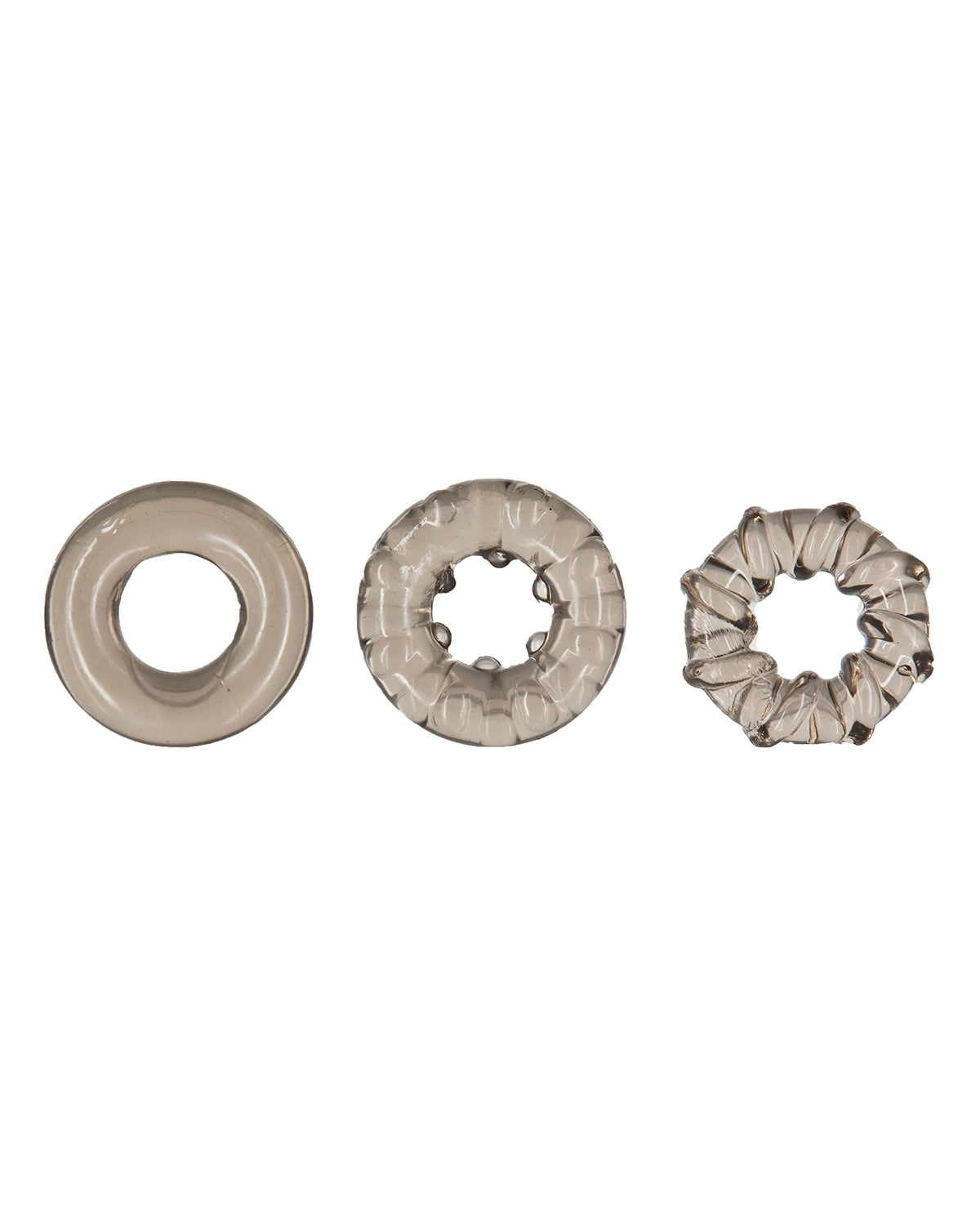 Komplet trzech pierścieni erekcyjnych o różnym kształcie.