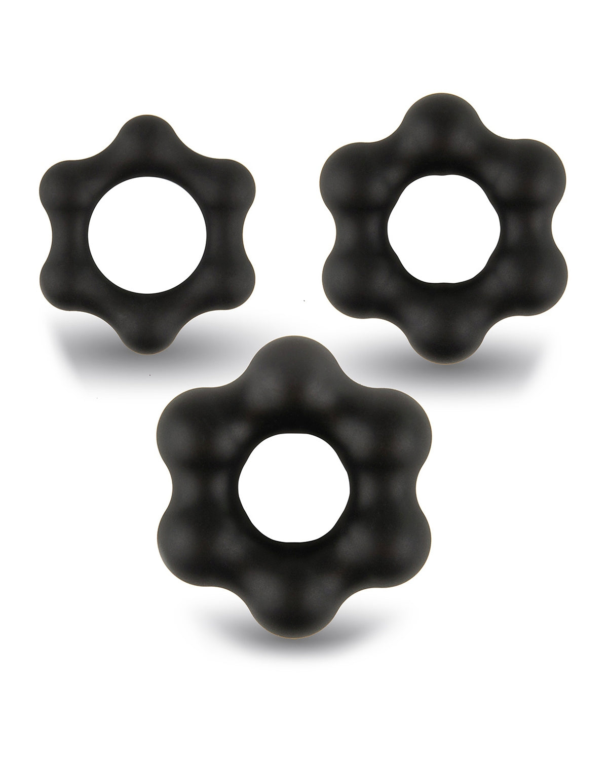 Każdy z ringów ma taką samą wyjściową średnicę wewnętrzną, ale inną grubość ścianki, dlatego jedne delikatnie obejmują penisa czy jądra, a inne mocno go ujarzmiają - w zależności od Twoich preferencji w danym dniu wybierz ten, który będzie Ci pasował.