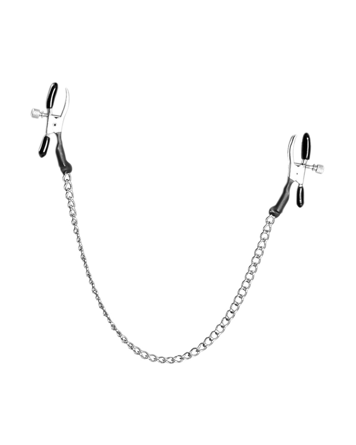 Oba zaciski połączone zostały łańcuszkiem, miło ociera się on o ciało, a także daje możliwość pociągania za niego dla zwiększenia doznań.