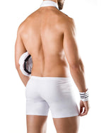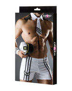 - białe szorty z ozdobnymi paskami  - wykonane z cienkiego, kryjącego materiału. Z przodu na nogawce srebrny emblemat. Model na gumce w pasie.