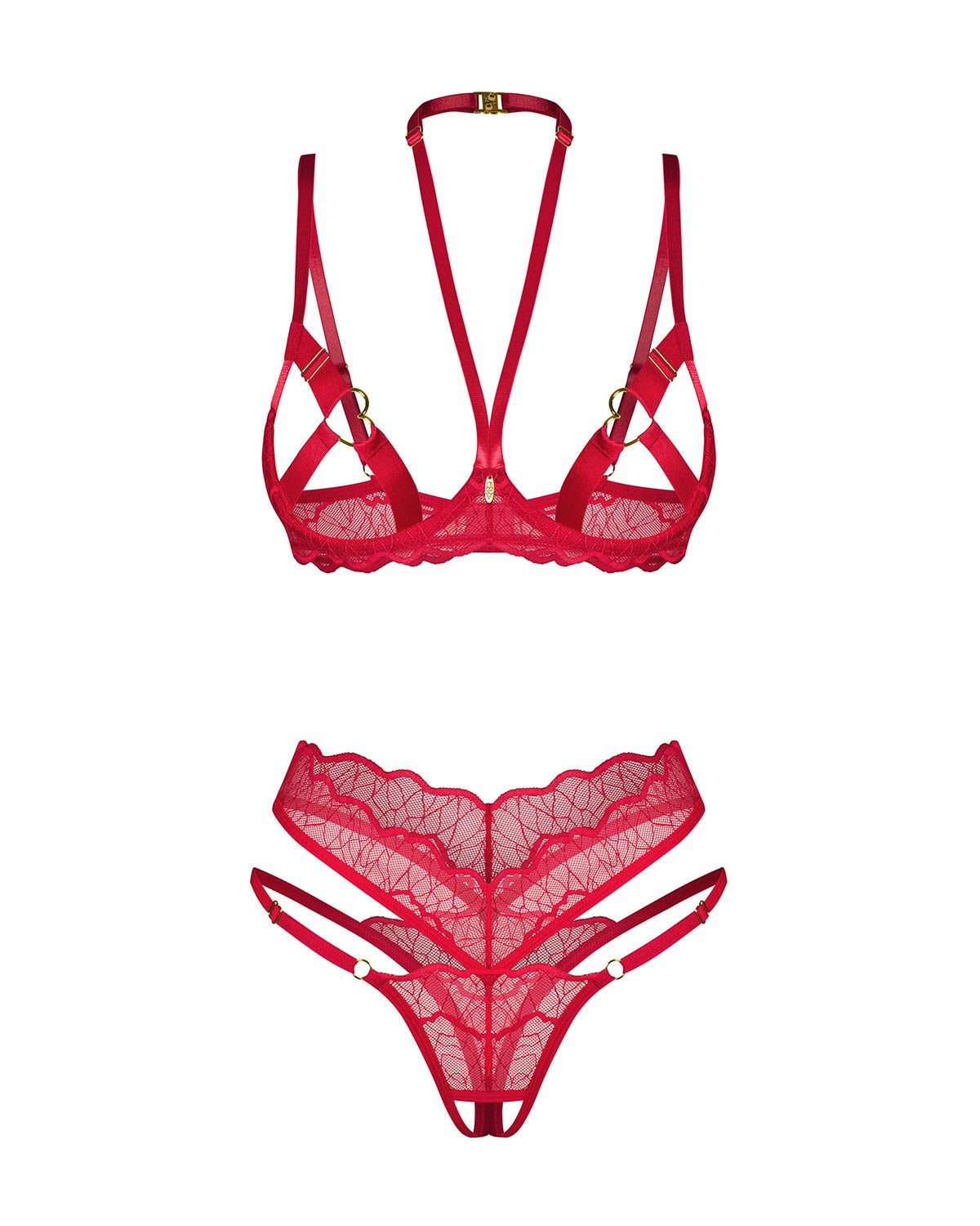 Cupide Desir marki Obsessive to wyjątkowy, dwuczęściowy komplet bielizny, który łączy w sobie uwodzicielski design i odważny charakter. Biustonosz z odsłoniętymi miseczkami oraz otwarte stringi tworzą zmysłowy duet, który podkreśli Twoją kobiecość.