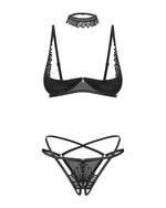 - ekskluzywny design: Półbiustonosz, otwarte stringi oraz choker w komplecie tworzą spójną całość, która przyciąga wzrok i pobudza zmysły.