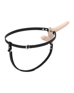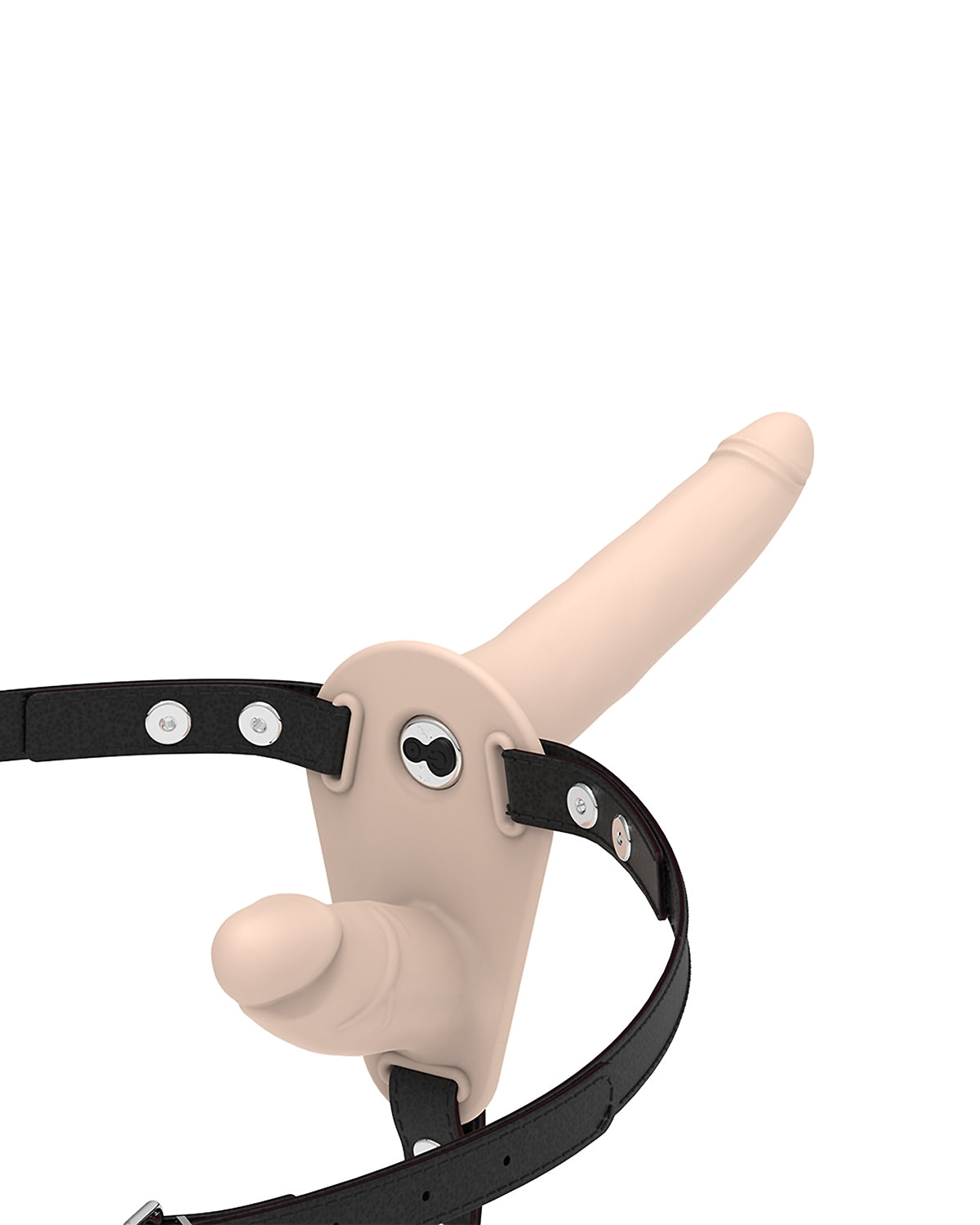 Dilda umieszczone są na szerszych paskach wykonanych z wegańskiej skóry. Forma jednego paska biegnącego pomiędzy pośladkami oraz drugiego wokoł bioder. Oba paski posiadają regulację długości wygodną klamrą, dzięki czemu możesz dopasować wielkość do własnych potrzeb.
