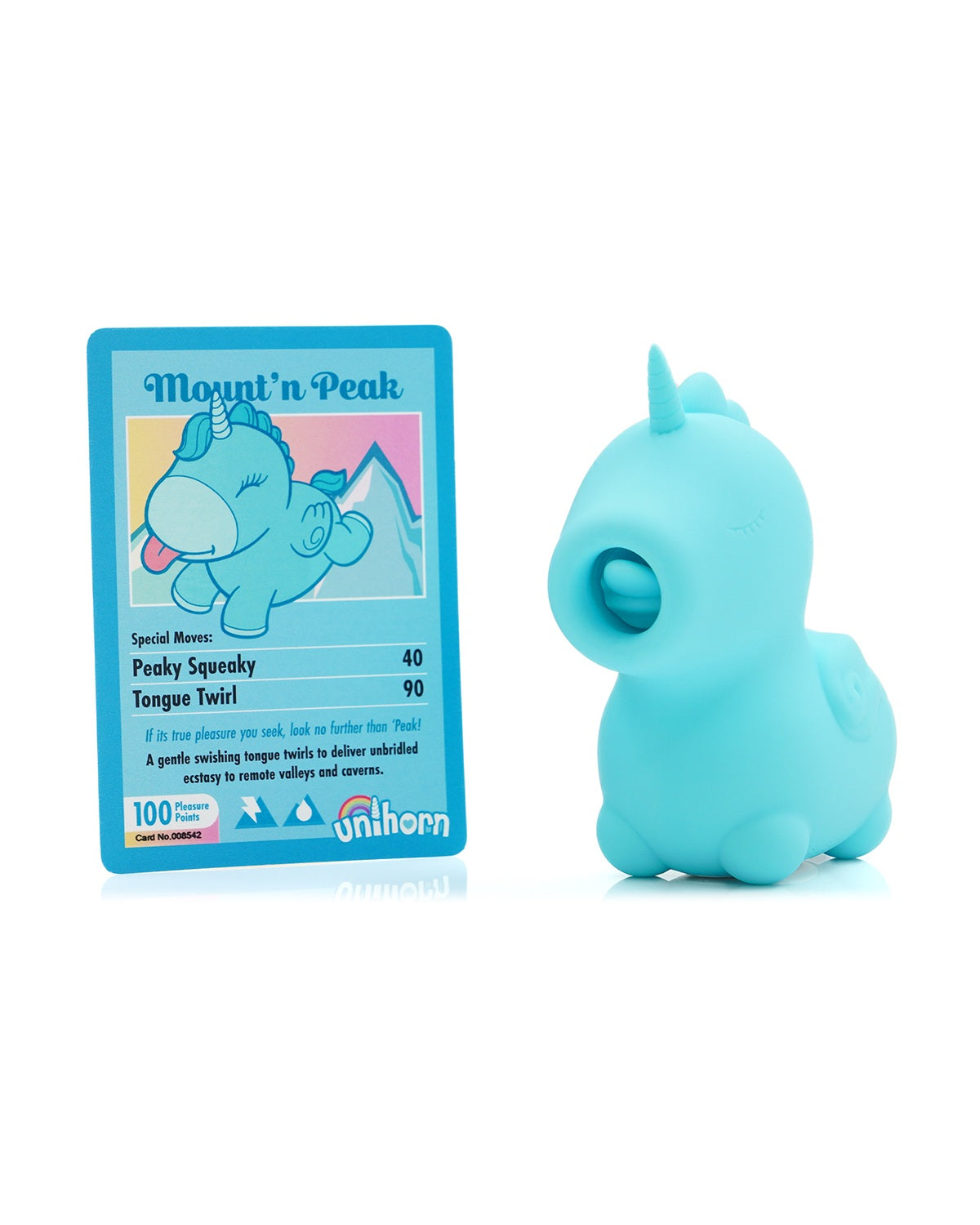 Mount’n Peak marki Unihorn to dyskretny, miętowy stymulator łechtaczki w kształcie jednorożca, wyposażony w zmysłowo zakrzywiony, ruchomy języczek i aż 20 trybów przyjemności (10 wibracji + 10 ruchów języka). Jego smukły, punktowy kształt zapewnia precyzyjną stymulację łechtaczki i pozwala przejść od subtelnego drażnienia do intensywnego szczytowania - za pomocą zaledwie kilku kliknięć.