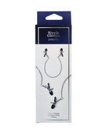 - wykonanie z najwyższej jakości materiałów: Zaciski i łańcuszek wykonane są ze stali nierdzewnej w kolorze srebrnym, zapewniając trwałość i bezpieczeństwo użytkowania. Czarne silikonowe końcówki na zaciskach gwarantują komfort i ochronę, a także łatwość w utrzymaniu czystości.