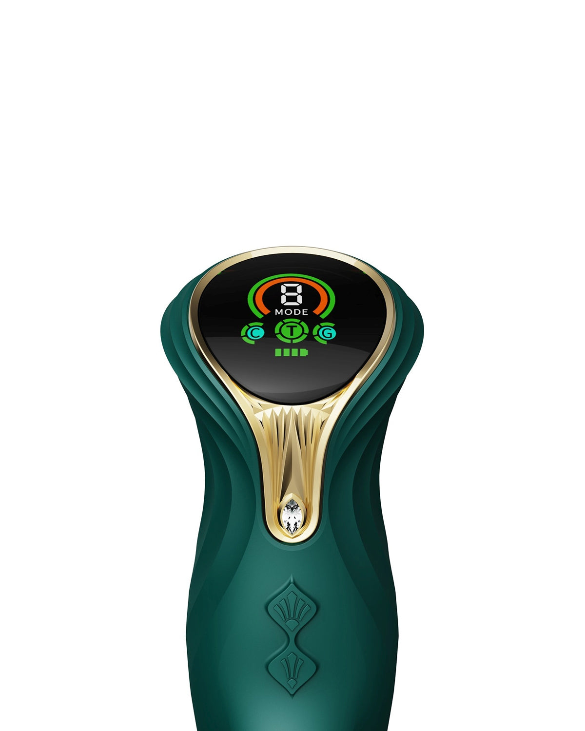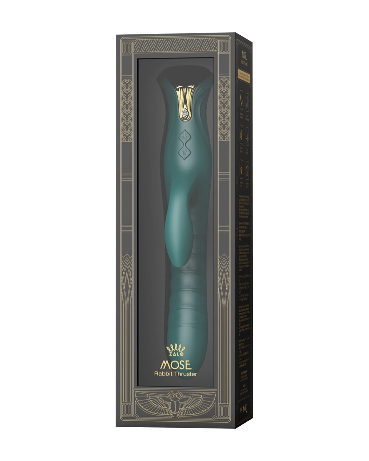 Mose, nowatorski masażer klasy premium z serii ZALO Legendary, teraz w odcieniu turkusowym z eleganckimi złotymi detalami. Mose, inspirowany mądrością faraona Thutmosisa z mitologii egipskiej, łączy estetykę z funkcjonalnością, oferując zarówno stymulację punktu G, jak i łechtaczki.