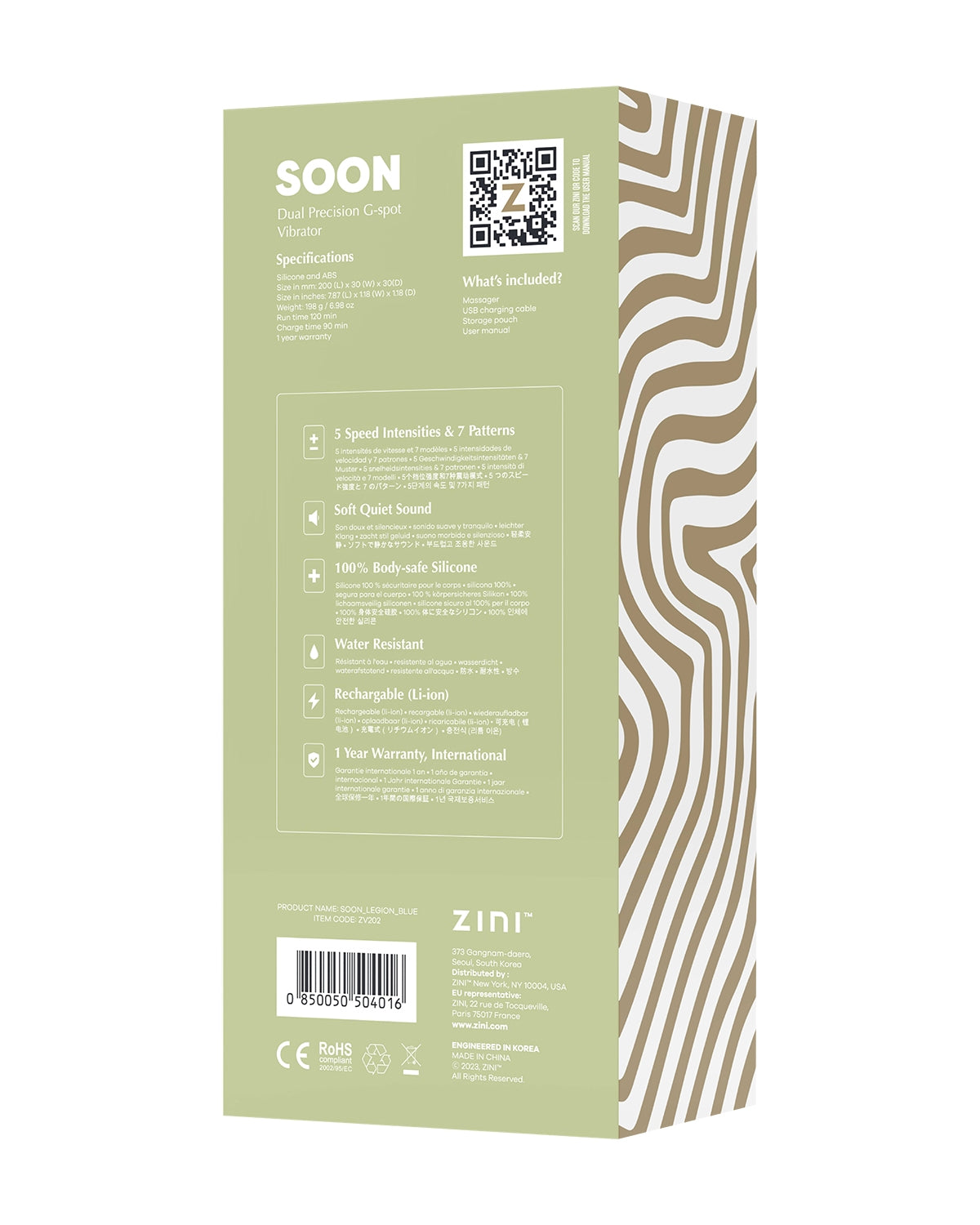 ZINI Soon to nowoczesny, dwufunkcyjny wibrator punktu G, który z łatwością odpowiada na potrzeby najbardziej wymagających użytkowników. Stworzony z myślą o zapewnieniu wyrafinowanej przyjemności, Soon łączy w sobie precyzyjne stymulowanie intymnych stref z elegancją wykonania.