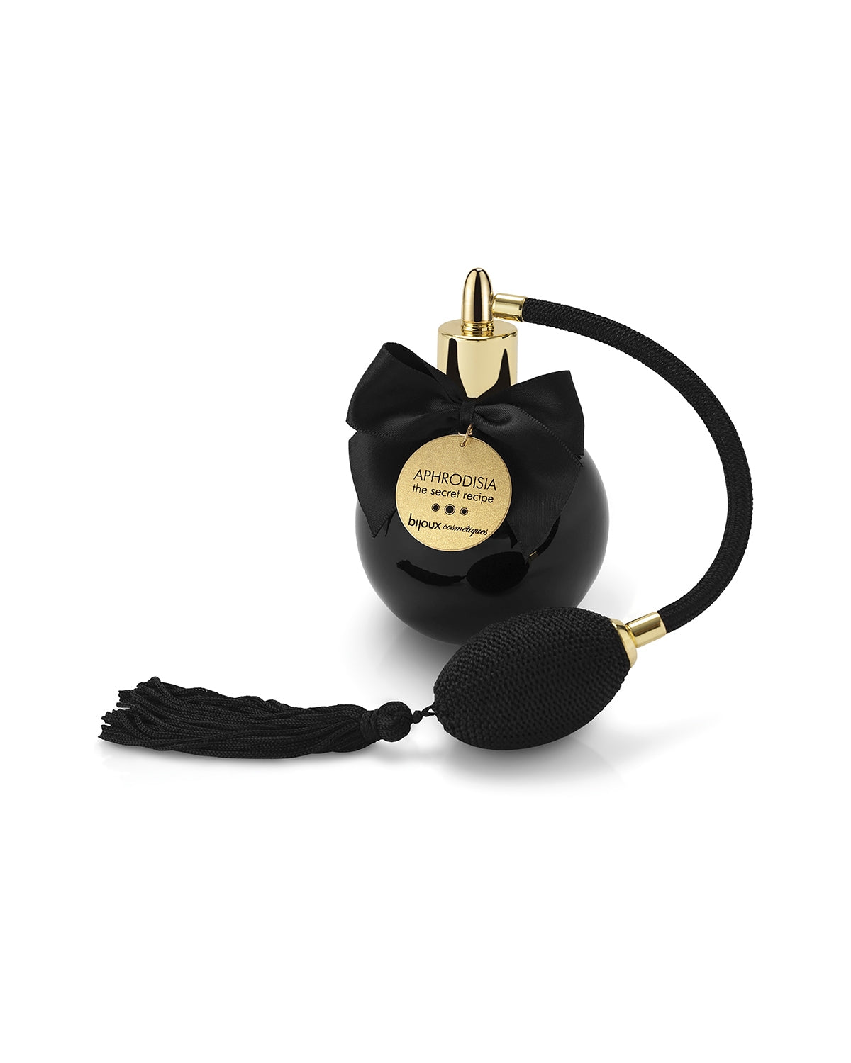 Produkt zamknięty jest w gustownym, szklanym flakoniku w stylu retro. Okrągła, czarna buteleczka zakończona została rozpylaczem oraz frędzelkiem.