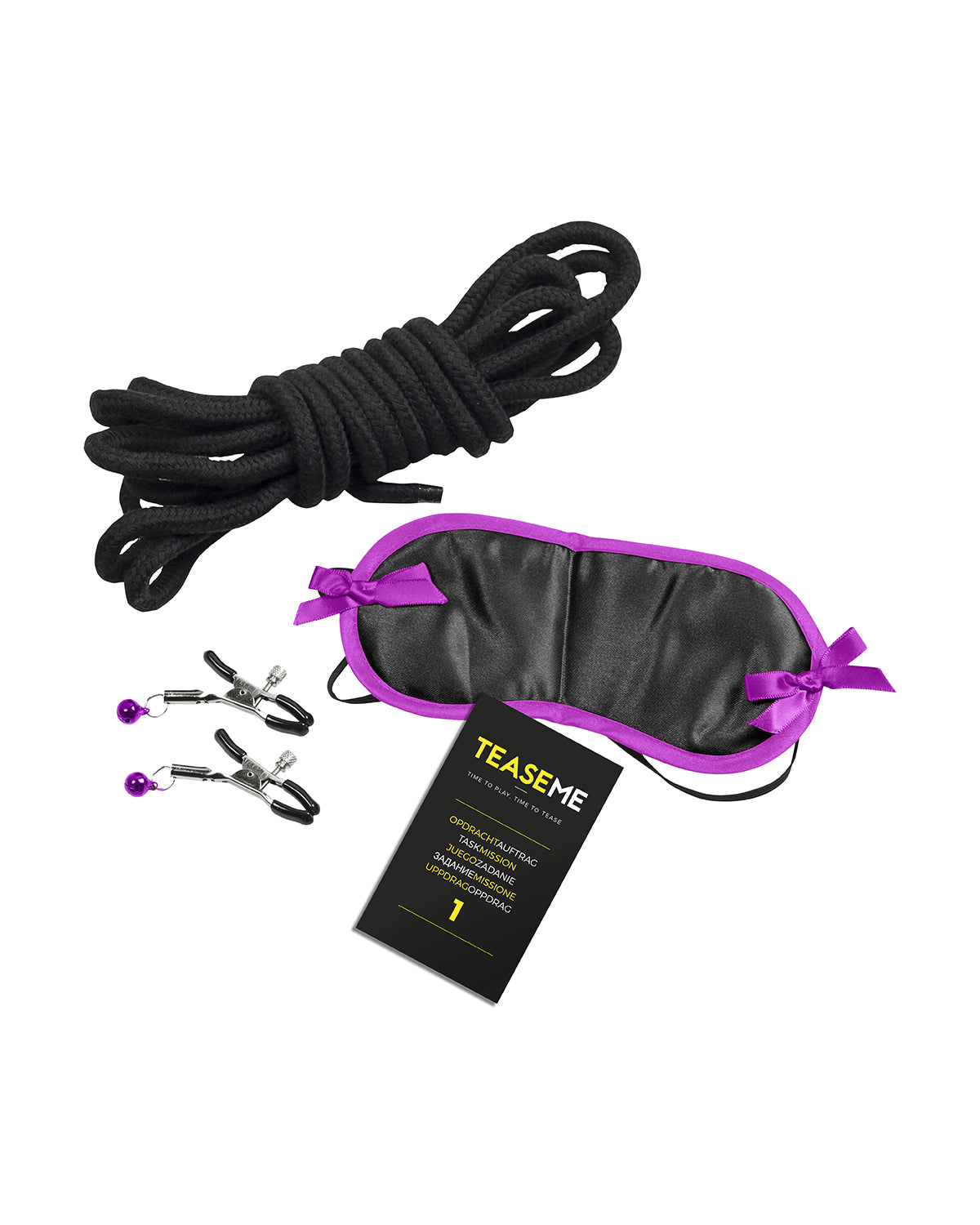Take a chance and be surprised by the various tasks that direct you to alternate between ‘undergoing’ or ‘performing’. Your senses are sure to be heightened to the max, especially when you use the various attributes, such as the mask, bondage rope, or adjustable nipple clamps. Tease & Please wishes the two of you lots of playful pleasure!