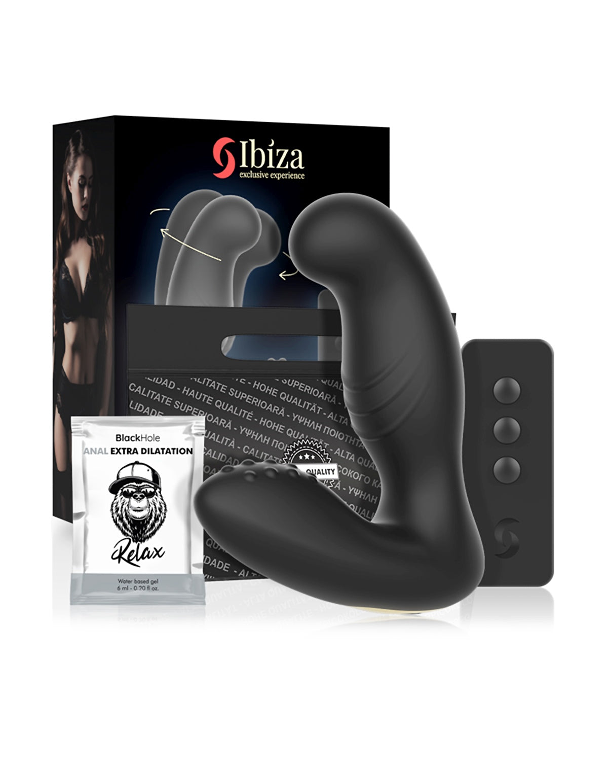 W zestawie: Zdalnie sterowany stymulator prostaty Ibiza Rotate Prostimulator, bezprzewodowy pilot, eleganckie opakowanie, czarna torba transportowa, ładowarka USB, pojedyncza dawka neutralnego lubrykantu Waterfeel, instrukcja obsługi.