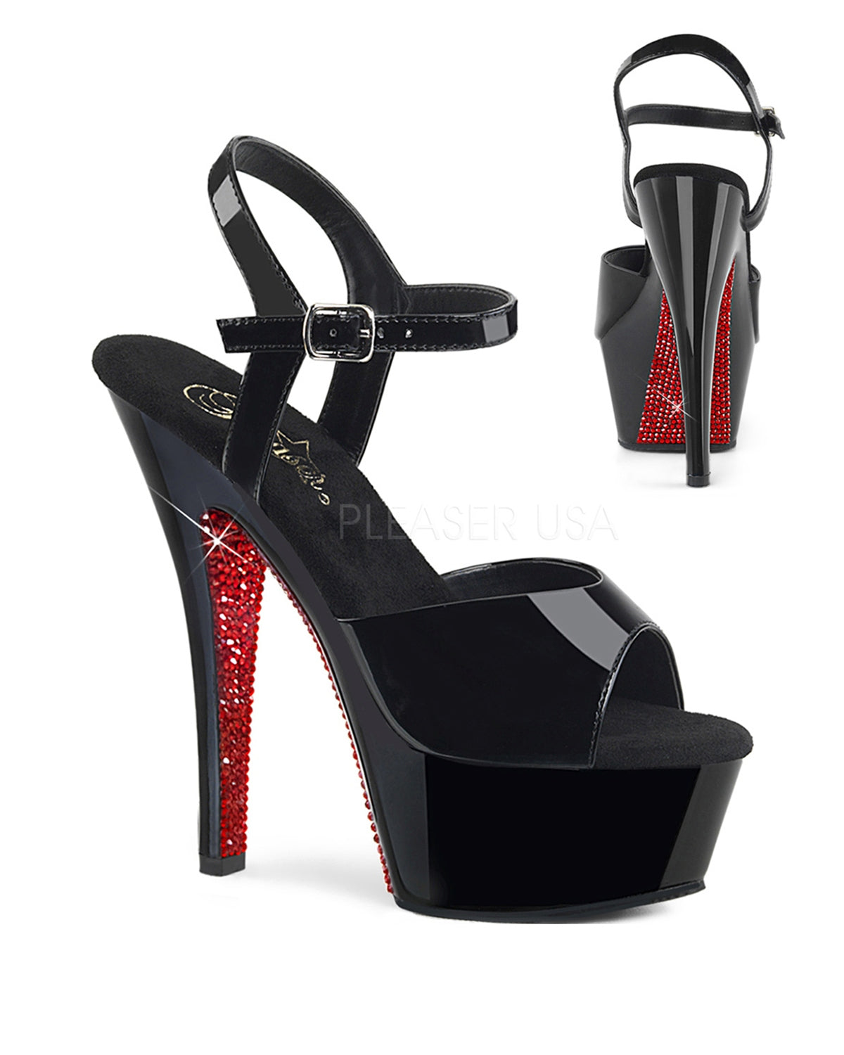 Obcas oraz spód ozdobione błyszczącymi, czerwonymi kamykami.