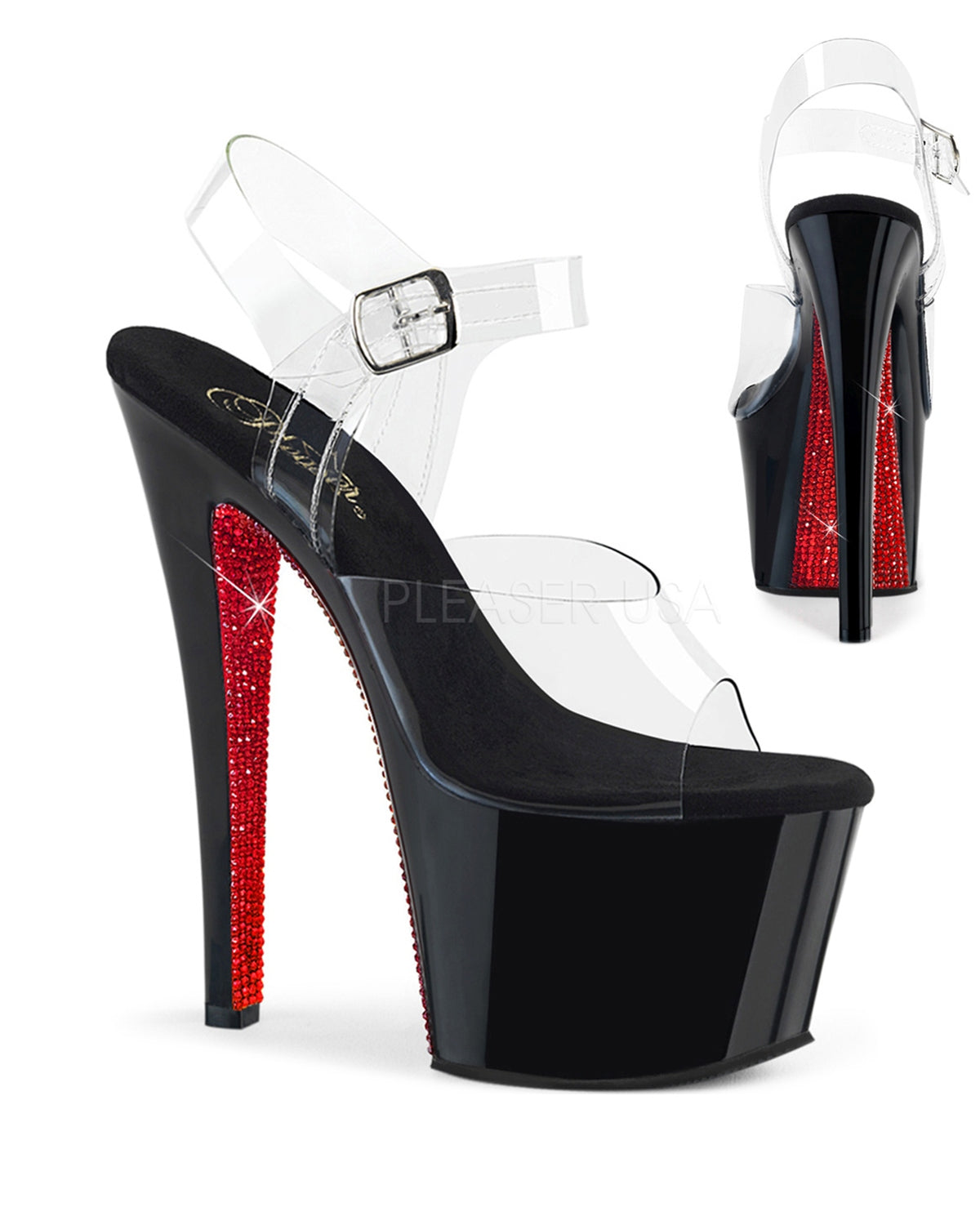 Obcas oraz spód ozdobione błyszczącymi, czerwonymi kamykami.
