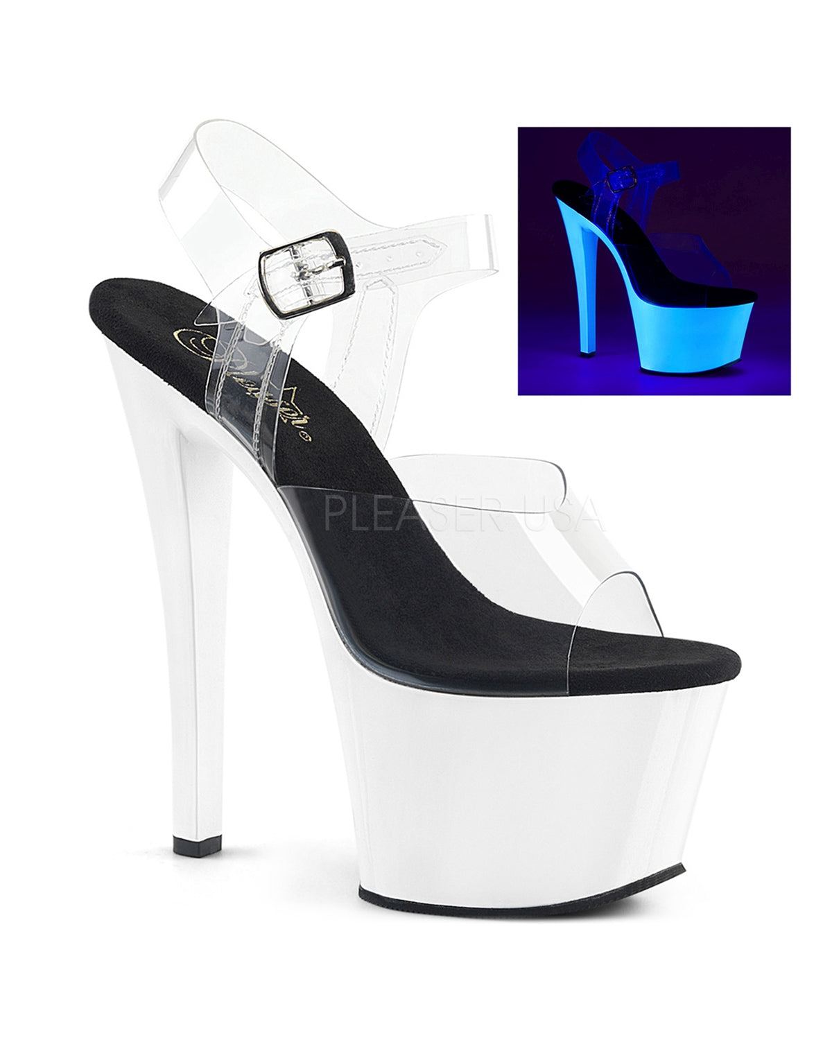 Biała platforma oraz obcas świecą w ultrafiolecie.