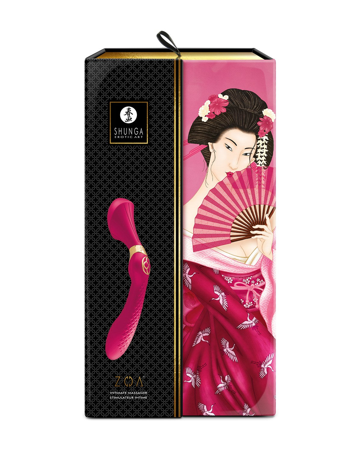 ZOA to dwustronny masażer, który pobudzi wszystkie wrażliwe kobiece strefy. Z jednej strony zakończony jest dużą główką, która ugina się lekko pod naciskiem i służy głównie do stymulacji łecztaczki. Możesz nią masować także inne obszary jak sutki, czy nawet obolałe mięśni karku. Świetnie sprawdzi się jako relaksacyjny masażer. Druga strona to wygodna rączka, która może stać się także klasycznym, dopochwowym wibratorem.