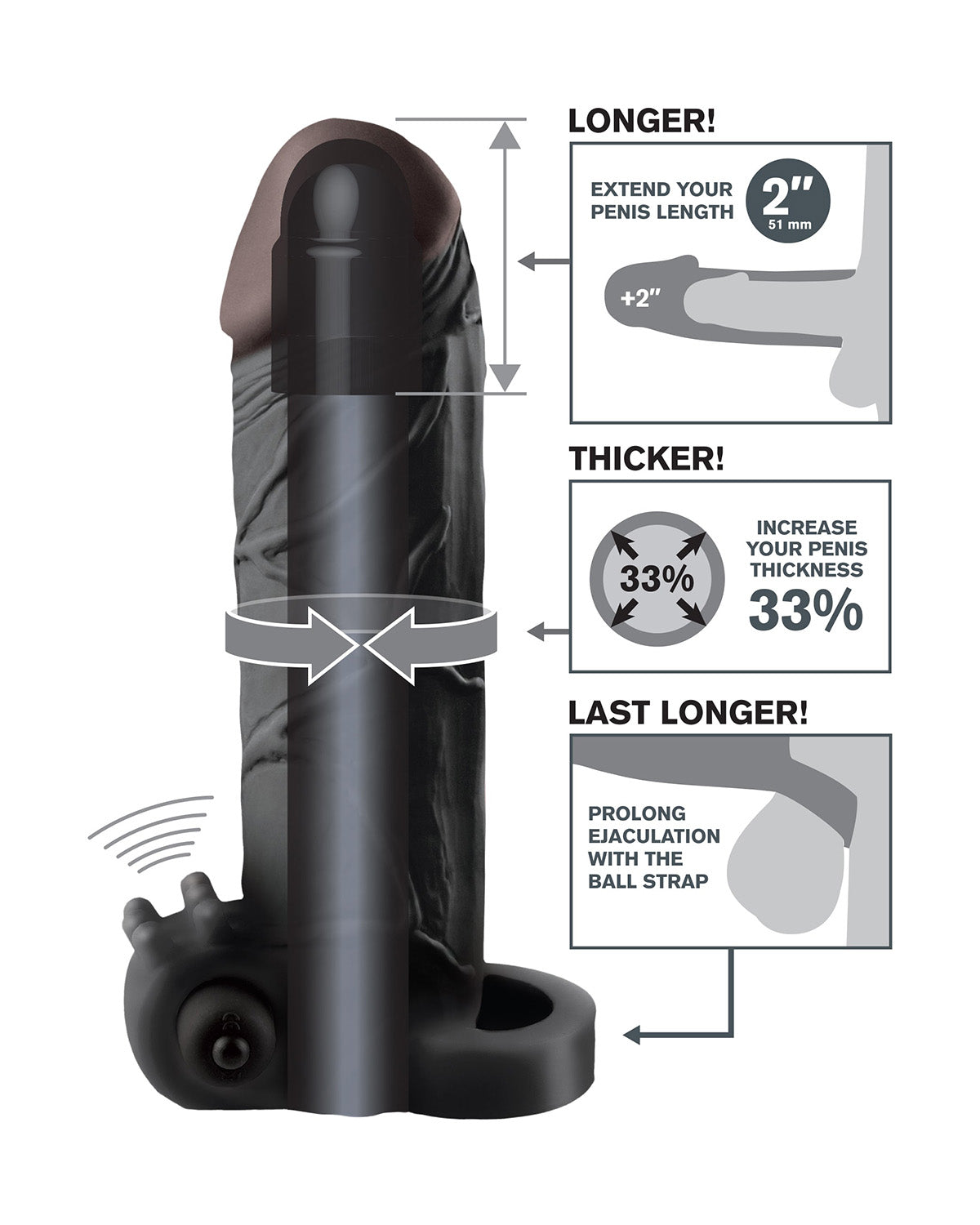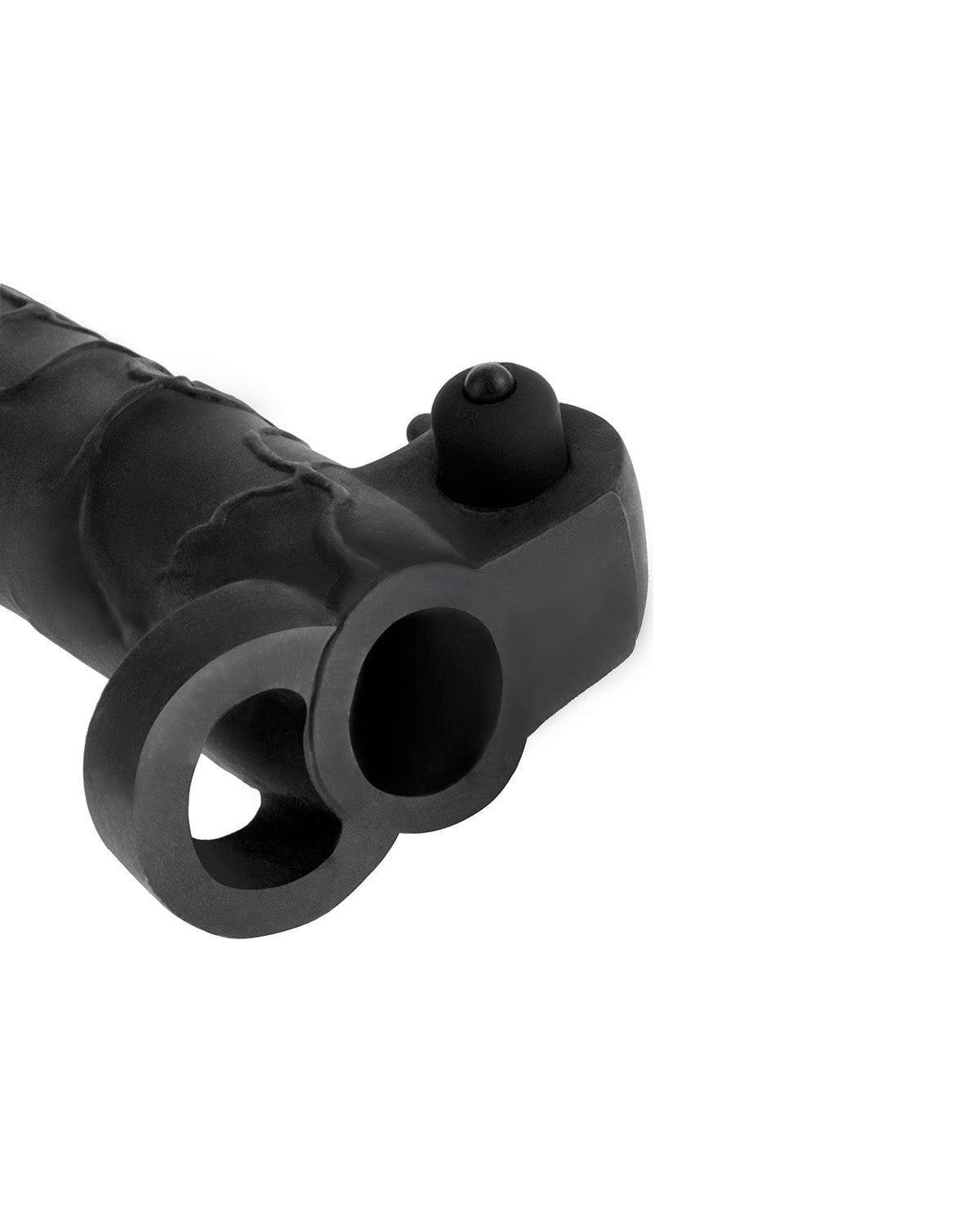 Przedłużka spełnia także rolę stymulująca. W dolnej części znajduje się rękaw z wibrującym pociskiem oraz miękkimi wypustkami. Element ten zapewnia intensywny masaż łechtaczki podczas penetracji.