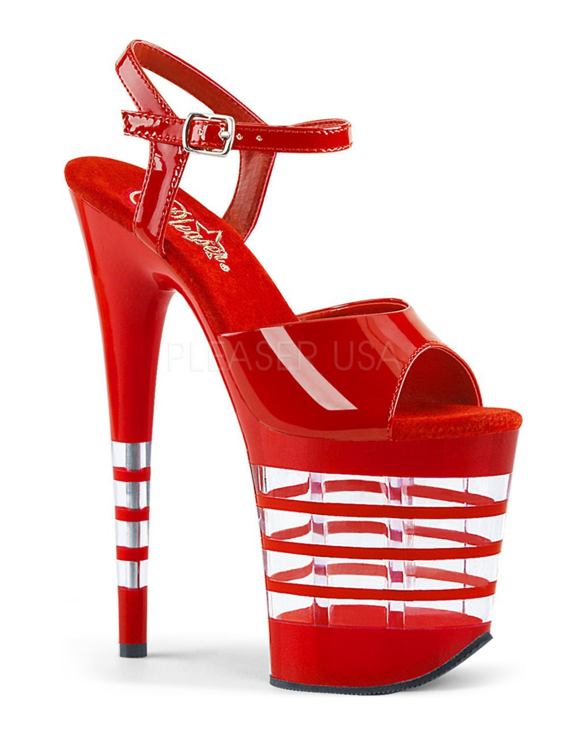 Platforma oraz obcas ozdobione poziomymi, transparentnymi pasami.